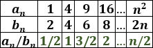 Calcular el término general \(c_n\) del cociente de las sucesiones, completar la siguiente tabla y calcular el décimo término del cociente: